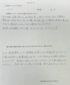 一番最初に施術を受けた時、すっきりした感じがしました。だんだん、体調が悪くなることが減ってきて、学校に行くのが楽になりました。今は全然気持ち悪くなることもなくなって学校も楽しいです。また、体調の事以外も色々なことを教えてくださって普段の家での生活にも気をつけることができました。約4ヶ月間、本当にありがとうございました。