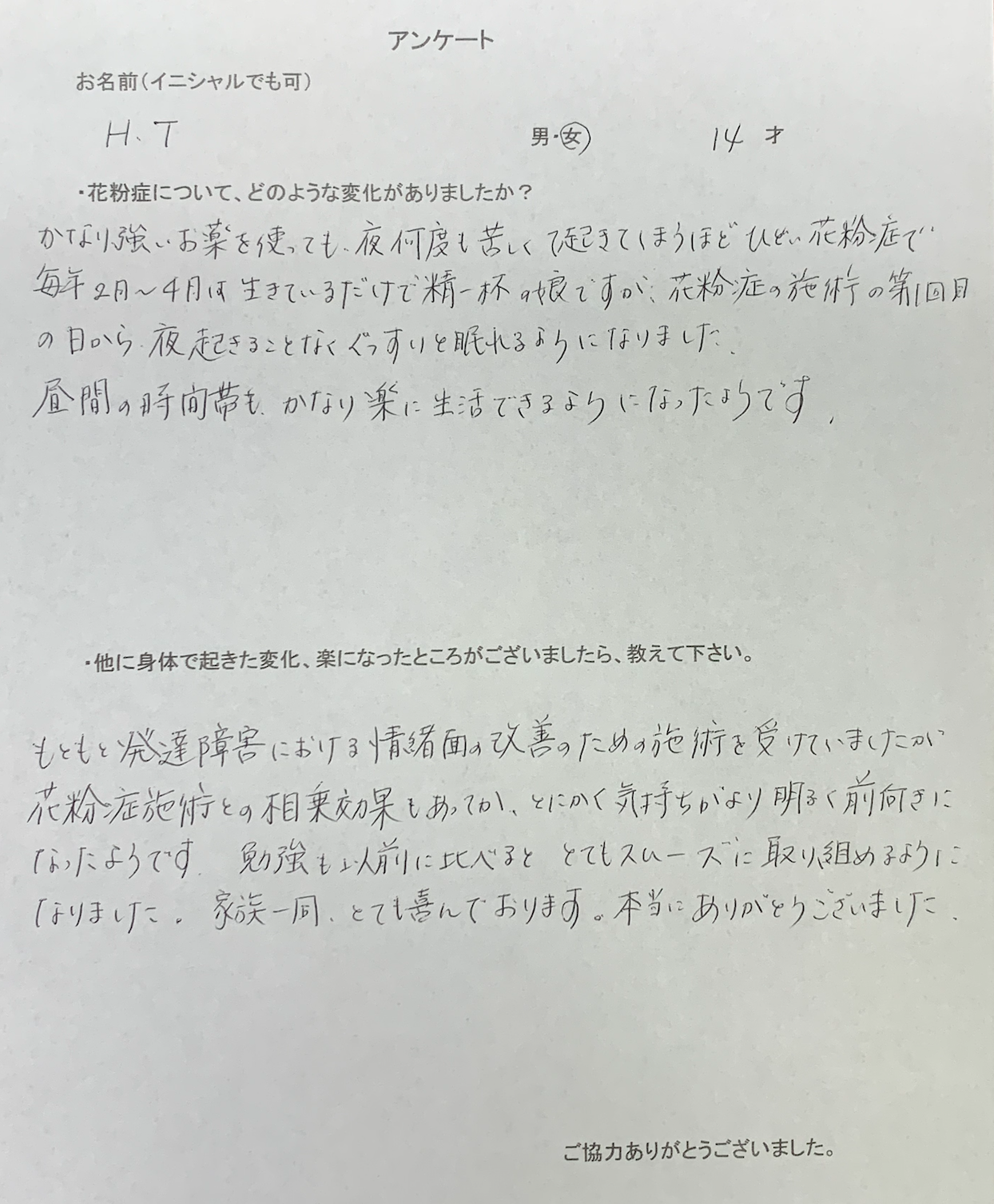 かなり強い薬を使っても夜苦しくて何度も起きてしまうほどひどい花粉症で、毎年2月〜4月は行きているだけで精一杯の娘ですが、花粉症の施術の第一回目の日の夜から起きることなくぐっすりと眠れるようになりました。昼間の時間帯もかなり楽に生活できるようになったようです。もともと発達障害による情緒面の改善のための施術を受けていましたが、花粉症施術との相乗効果もあってか、とにかく気持ちがより明るく前向きになったようです。勉強も以前に比べるととてもスムーズに取り組めるようになりました。家族一同、とても喜んでいます。本当にありがとうございました!