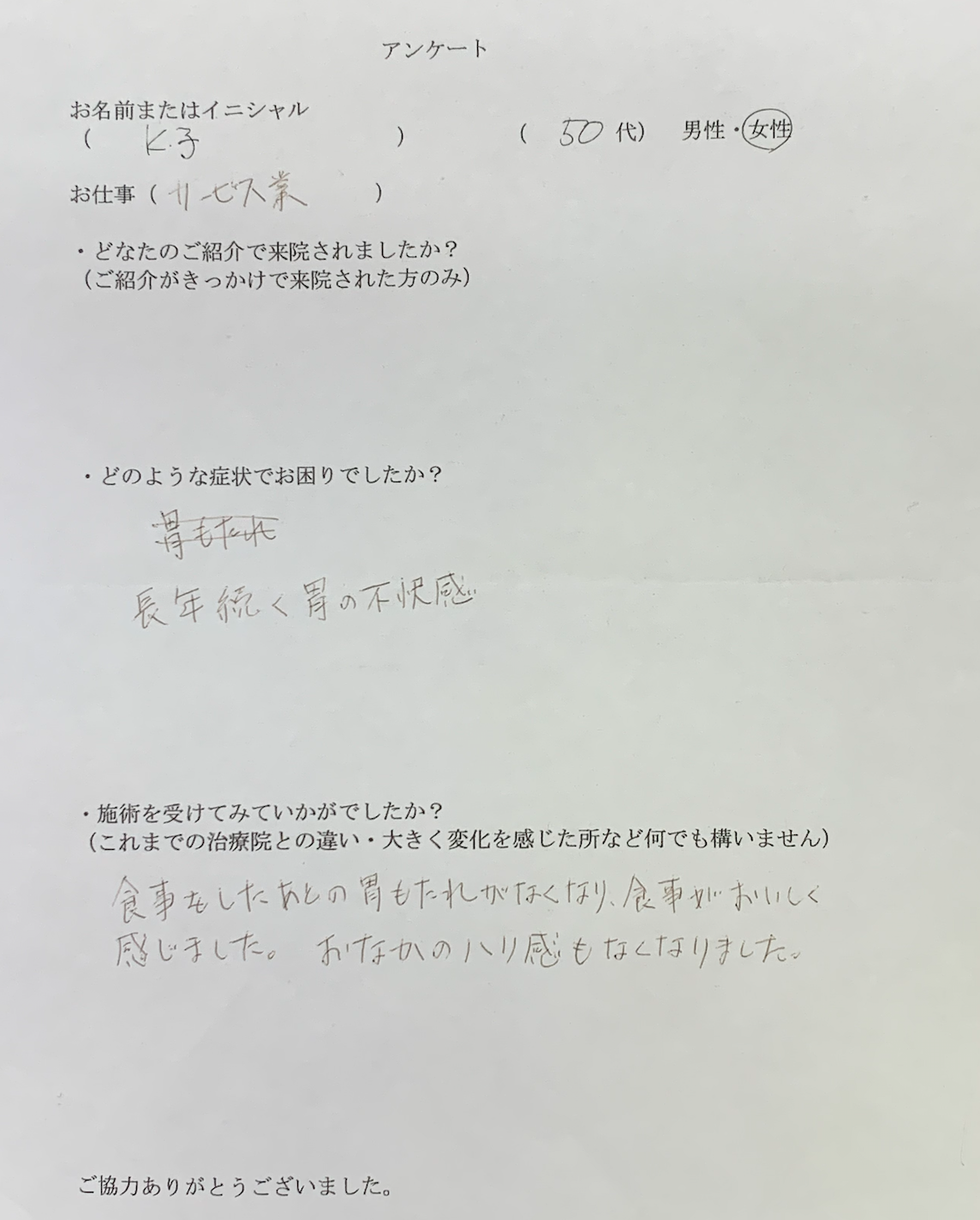 長年続く胃の不快感、食事をした後の胃もたれがなくなり、食事が美味しく感じました。お腹の張り感もなくなりました。