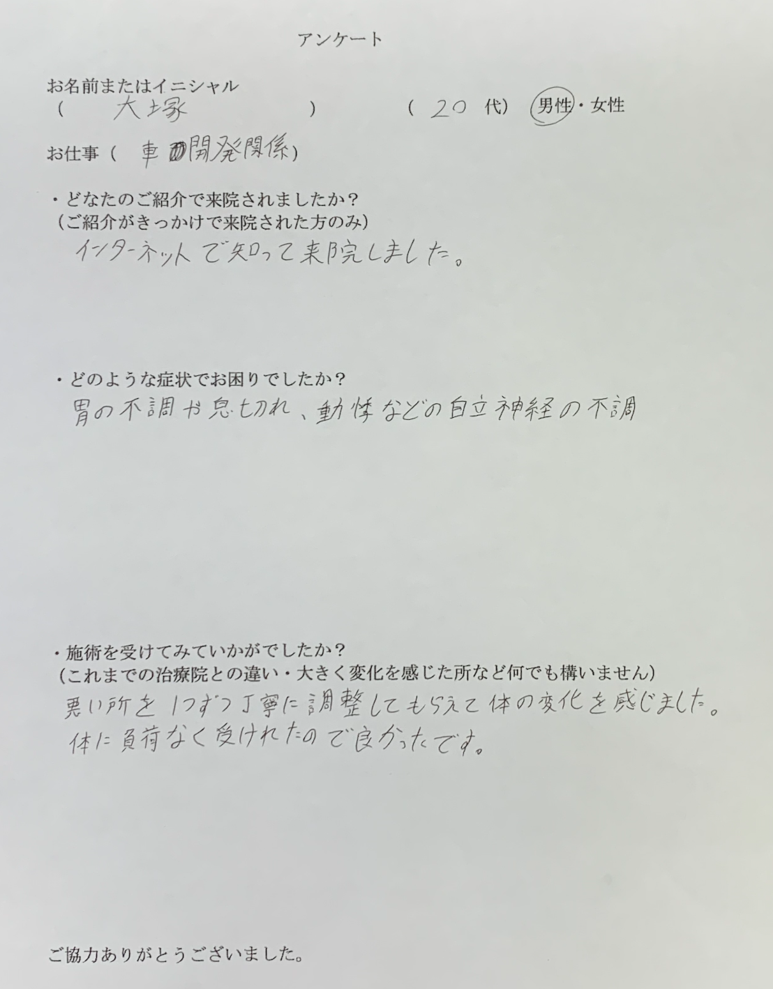 大学受験を控えた秋に、胃痛が出てしまい、学校にも行けない日が続いてしまいました。病院に行っても原因はストレスだろうと言われ、処方される薬では収まらず、このまま受験もできるかどうか分からない不安に駆られていたところ、アシスト整体院に通うようになりました。構造的アプローチだけではなく、カウンセリングもしていただいた結果、なんとか受験当日コンディションが良く最後まで受けきることが出来、無事に第1志望大学に合格することが出来ました。ほんとうに感謝の気持ちでいっぱいです。ありがとうございました。